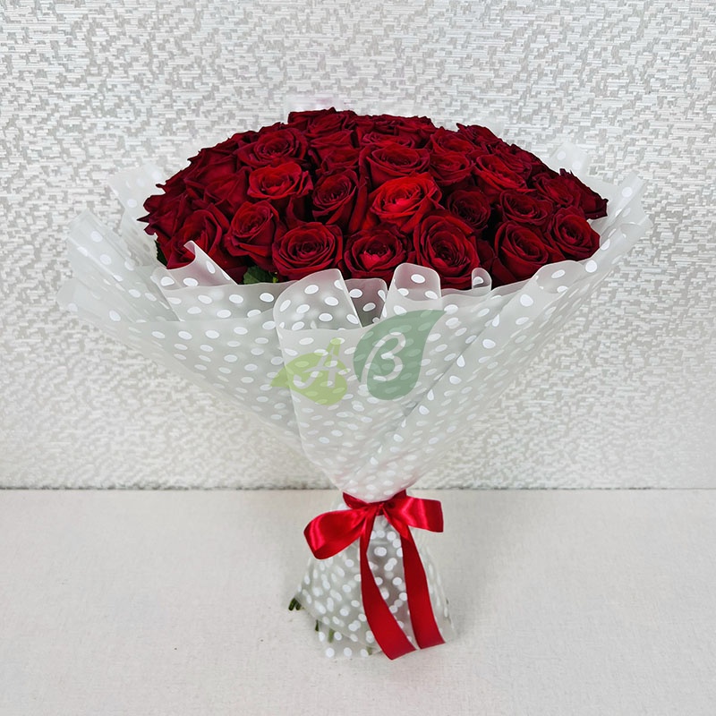 • Роза - 51 штука, цвет - красный, длина стебля - 40 см;