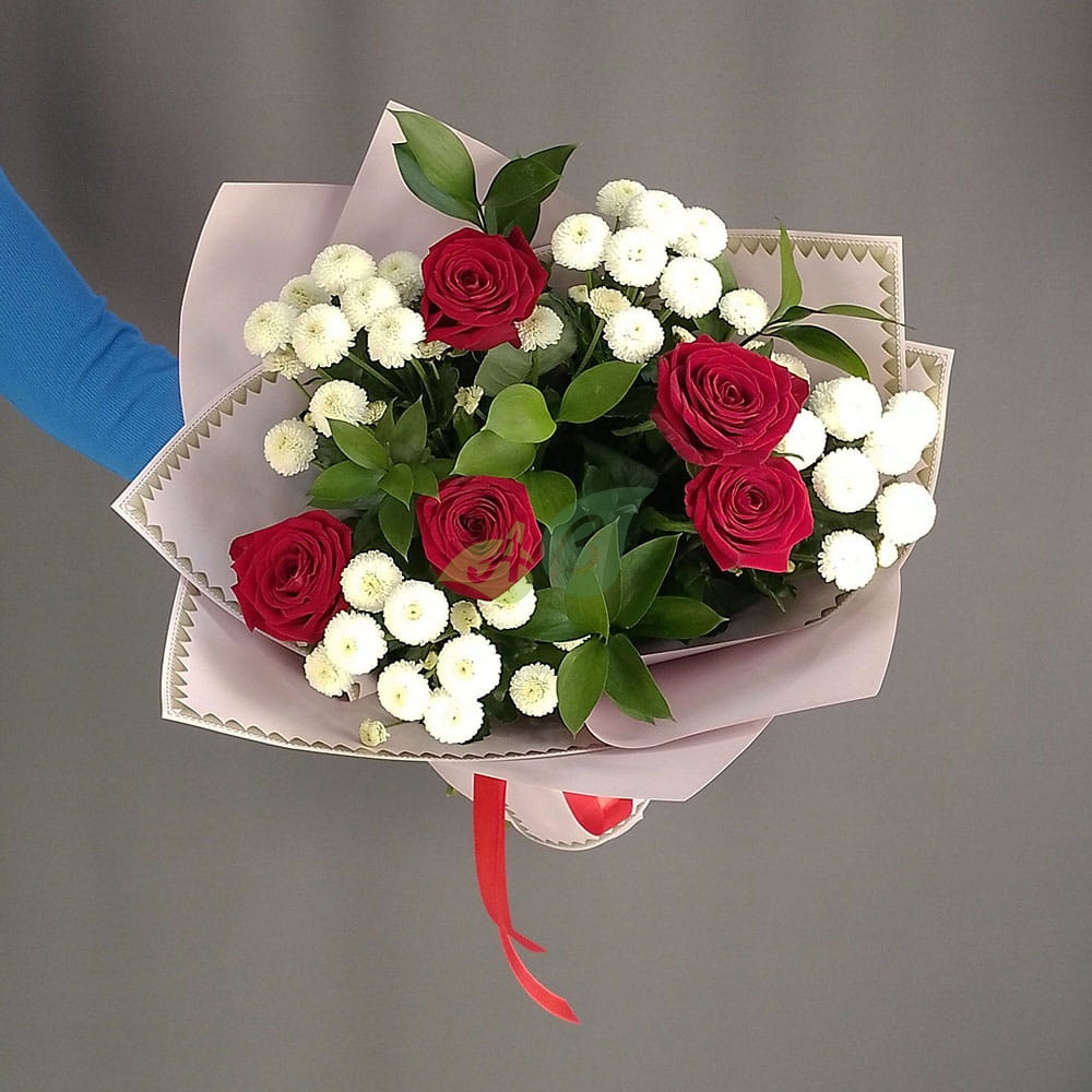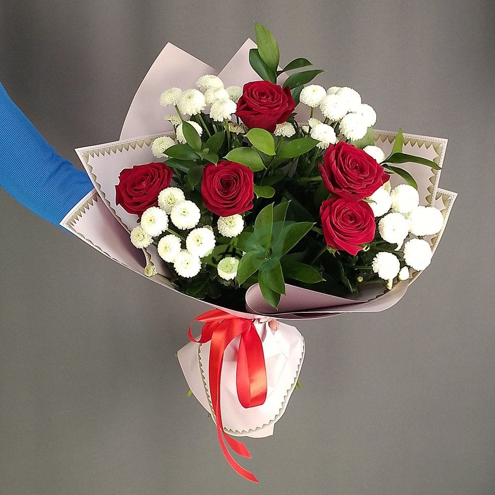 5 красных роз в сочетании с белой хризантемой и зеленью рускуса выглядит просто великолепно. Он говорит о вкусе дарителя, о том, что он ценит неповторимость того, кому предназначен этот букет.